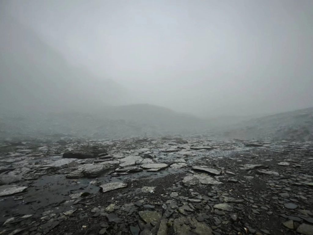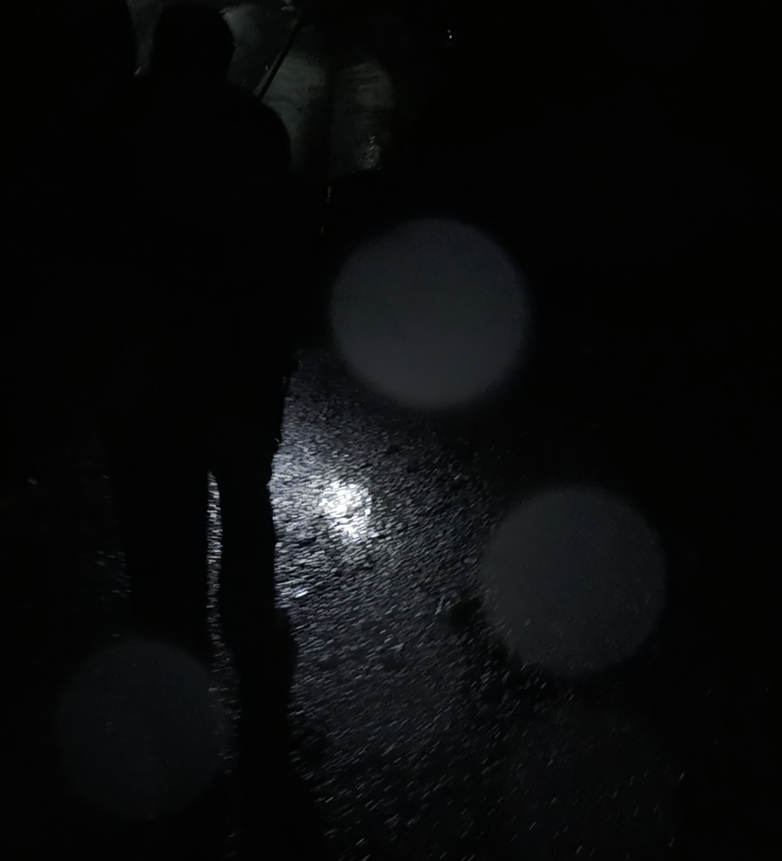 出发,这真是伸手不见五指,啥也看不到,就靠头灯照明能看到路,拍的照片都是乌漆嘛黑一片,中途还下起了雨,挺大的,向导说雨要是再下就得下撤了,好在后来停了,同时可能是注意力被转移,或适应了海拔的缘故,高反的症状也不太明显了,虽然还是头疼,但总的可以忍受,不影响行进。