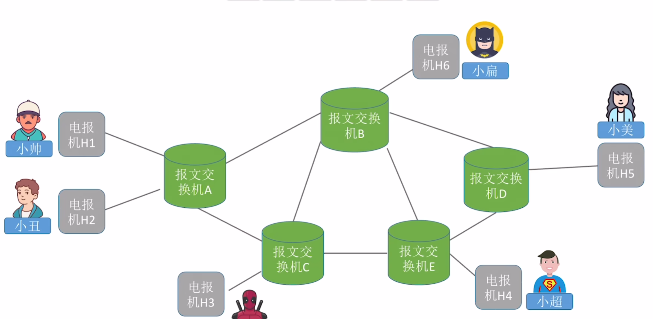 控制信息里包含发送方的地址和接收方的地址,用户数据则是发送信息的内容,当h1向h5发送报文时,报文先经过报文交换机A,交换机会将报文存储下来,并识别控制信息了解发送地址,用户数据不会进行查看,了解发送地址后交换机会将报文发送到下一个交换机,并重复以上流程,直至将报文发送到接收人的地址,交换机会找到一条最合适的转发路径,如果途中某条路径过于拥堵,则会寻找其他报文交换机从而绕开拥堵路径