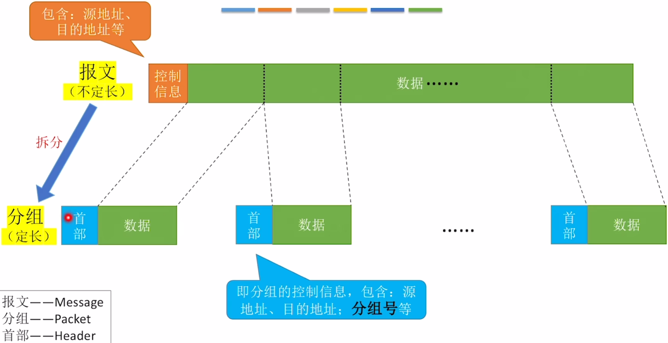 分组交换会将不定长的报文分成若干个定长的分组,并且每段分组都有首部信息