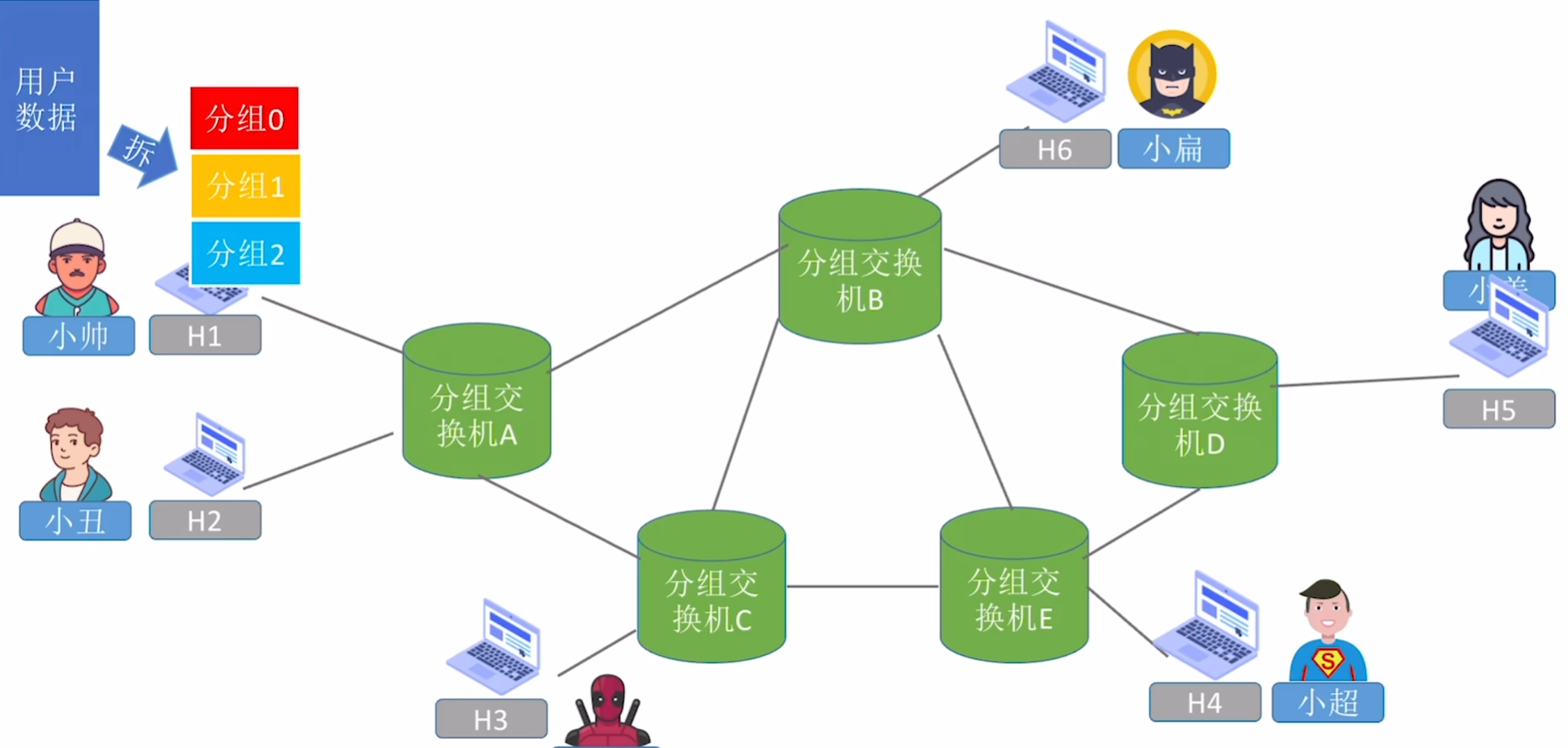 用户数据会被拆分为若干个分组,将分组传输到交换机中,因为每个分组都有首部信息,可以分组为单位传输(不需要像报文传输一样一次传输整个报文),每个分组可以走不通链路,只要最后能到达目的地即可,所有数据都传输完成后通过首部信息计算机可以将数据拼接起来,之后合并为用户传输的数据